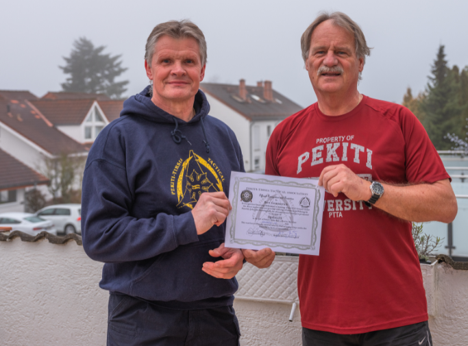 Eigentlich war diese Ehrung im Rahmen der diesjährigen Europäischen Trainingskonferenz der Pekiti Tirsia Tactical Association (PTTA) in Andalusien vorgesehen, doch in Corona Zeiten ist alles anders. Am 12. Dezember 2020 besuchte der Direktor der PTTA Germany Mandala Johannes Renninghoff im Auftrag von Tuhon Jared Wihongi/USA Bert überraschend zu Hause und würdigte seine außergewöhnlichen Verdienste um diese Kampfkunst. „Wir wollten dieses Jubiläum nicht einfach so verstreichen lassen“ stellte Johannes bei seiner Rede heraus, auch wenn es natürlich sehr schade ist, so ohne die Sportfreunde eine solche Ehrung vorzunehmen. „Wir sind beide zusammen einen großartigen und erlebnisreichen Weg gemeinsam gegangen und haben dies in vielerlei Hinsicht als eine Bereicherung für das Leben empfunden!“ Seit 20 Jahren nun organisiert Bert Seminare auch mit internationalen Referenten und das Stützpunkttraining des Hessischen Ju-Jutsu Verbandes in Taunusstein. Hier ist er auch regelmäßig als Mitglied des Instruktoren Teams aktiv. Schon 2005 – damals selbst noch ein Schüler – gründete er die erste Pekiti Tirsia Gruppe in Taunusstein. So konnte er sein erlerntes Wissen und seine Fertigkeiten weitergeben. Seit dieser Zeit organisiert er auch mit Hilfe seiner lieben Frau Hilde zahlreiche internationale Trainingsveranstaltungen im Ausland und wurde 2015 zum „Director of Special Events“ der PTTA ernannt. Auch die erste von ihm organisierte Reise auf die Philippinen zu einem 10tägigen Trainingsevent im Ursprungsland dieser Kampfkunst fand innerhalb der „PTTA Community“ großen Anklang. Hier schlossen sich Teilnehmerinnen und Teilnehmer aus ganz Deutschland an. Mehrere Videoaufzeichnungen, die Bert mit großem Zeitaufwand produzierte, sind heute noch für viele Tirsians (so werden die aktiv Übenden genannt) eine große Trainingshilfe. Immer auch nahm Bert aktiv am Training teil, um sich selbst weiter zu entwickeln. Mittlerweile gibt es im Taunussteiner Verein feste Trainingsgruppen, darunter sogar eine Kinder-/Jugendgruppe, die ebenfalls Bert im Jahr 2016 gegründet hat. Mit dem Training hält sich der pensionierte Polizeibeamte fit. Bereits drei weitere Trainer hat Bert mit ausgebildet, die ihn beim Training im Verein unterstützen. Wir wünschen Bert und uns, dass er noch viele Jahre seine Faszination und Hingabe für diese Kampfkunst aktiv gestalten kann und dem Verband weiterhin in seinen Funktionen zur Verfügung steht.