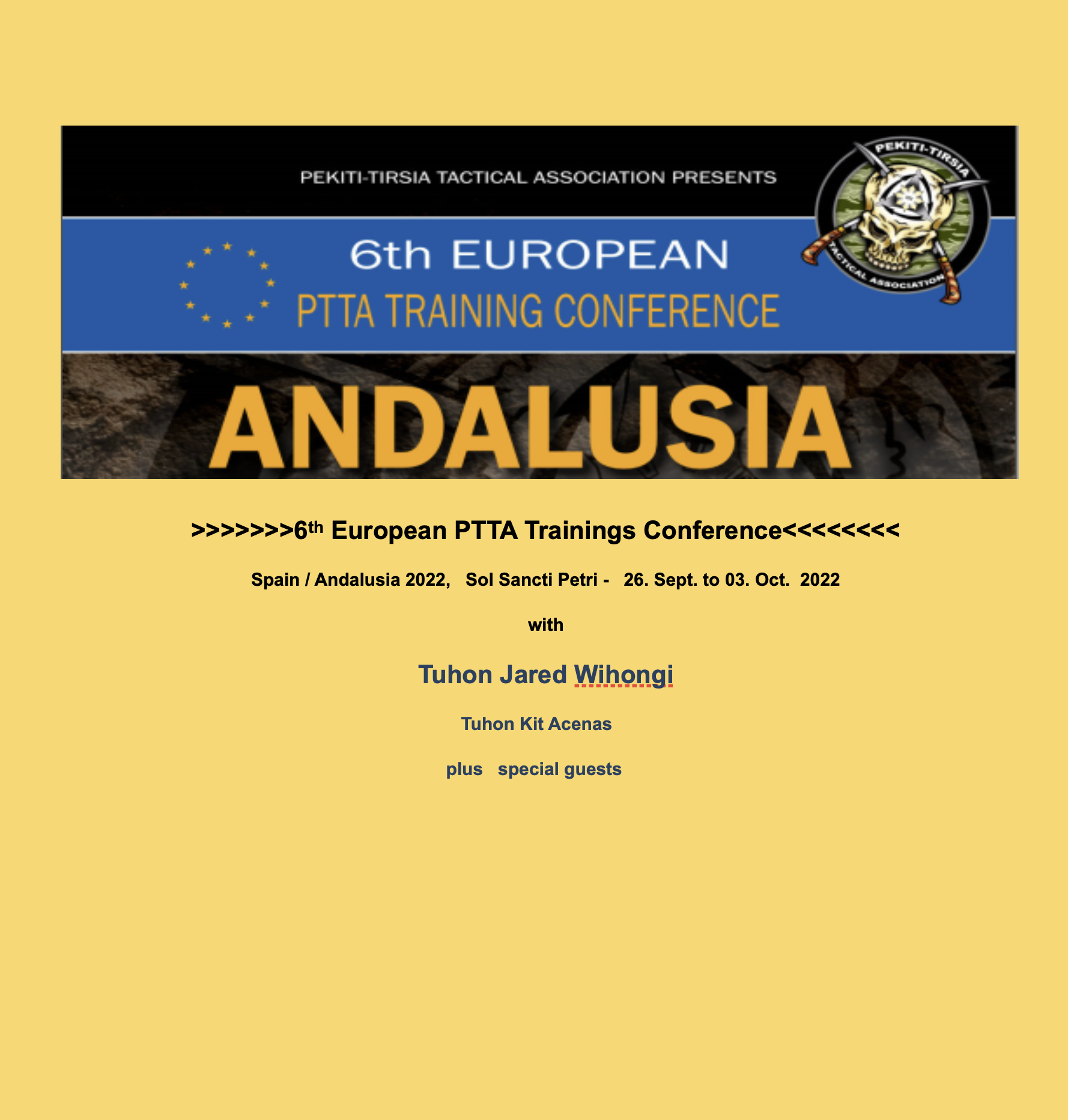 Hello Kalistas of the Pekiti-Tirsia Tactical Association / USA We have a very special event in preparation 6th European PTTA Trainings Conference in Andalusia, Spain.
