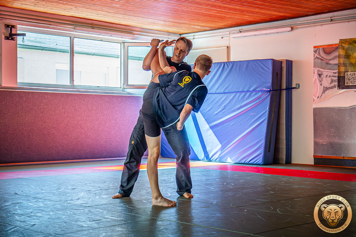 Der zweite Seminartag stand im Zeichen von intensiven Übungen und Drills zur Messerabwehr mit waffenlosen realitätsnahen Übungen.